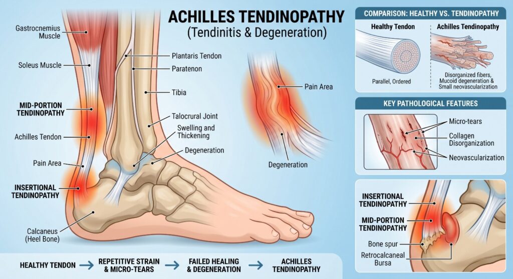 Mid-portion or insertional Achilles pain in active patients.